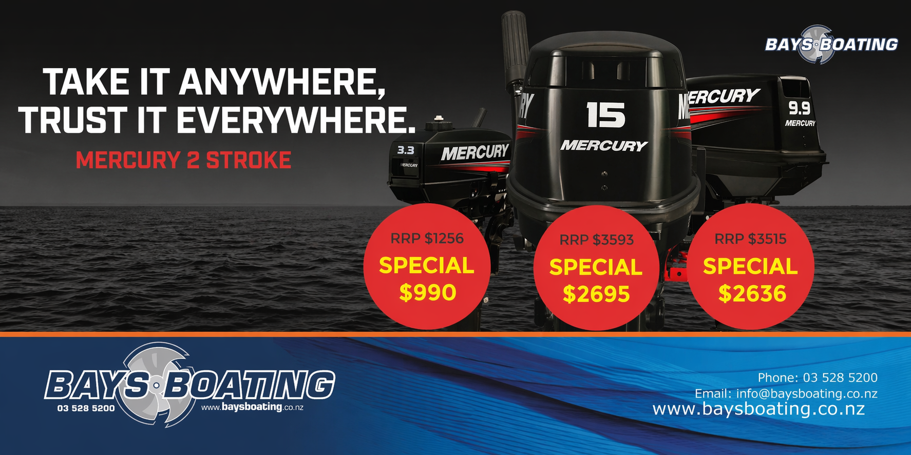 With the region’s largest marine retail and service centre, located in Motueka, next to the lovely Abel Tasman area, Bays Boating Ltd is your go-to for the best brands in New Zealand boating and water sports including Stabicraft, McLay, Fi-Glass, Haines Hunter, Honda and Mercury.